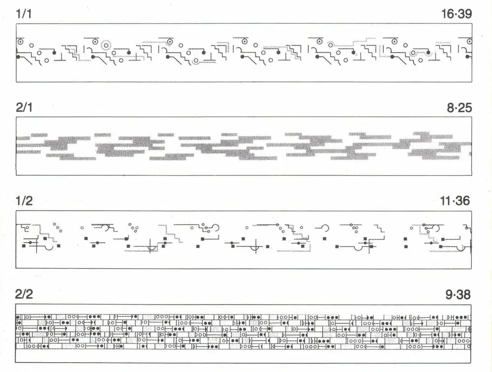 My usage of phasing is intentional, I would rather you not search for a downbeat, I want you to remain focused on your individual pulse and remain in the moment. The overarching structures of durational sequences phasing in-between themselves through a variety of numerical values are too large, and too long in time to keep track of where they begin and where they restart. All that we can cling to is the clock, the singular determining factor, the tempo and its multiples alone. To try to focus on the wider phrasing beyond the individual clicks is to distract yourself from the rhythmic nowness of each track. We aren’t in 4/4 over 5/4 over 6/8, but rather, we remain in 1/1 at all times. Stay in the nowness, enjoy it.”