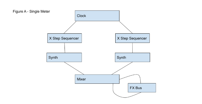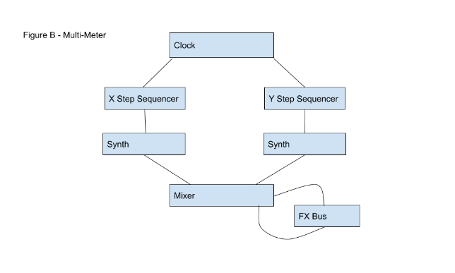 In Figure B we see almost the same signal flow, all materials will remain generated by a single clock. The change occurs through the implementation of multiple meters, as demonstrated by setting the Step Sequencers at two or more individual meters. By allowing for multiple tracks of rhythmic phrases, such as a snare in 6/8 over a kick drum in 4/4, we enter a state of simple phasing a la Steve Reich, which is just a Westernization of polyrhythmic techniques heard in West African percussion.