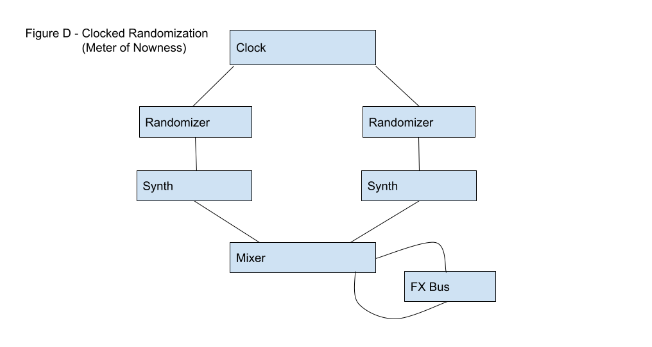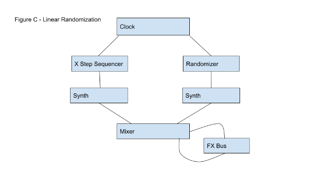 In Figure C we see the introduction of randomness by removing one or more of the Step Sequencers and replacing them with a Clock controlled Randomizer, or random sequence generator. A Randomizer receives a steady pulse and generates random patterns through voltage-controlled settings determined by the composer. It is one of the most efficient tools to achieve chance encounters in the contemporary electronic music workspace. The result is a combination of set meter and loopable sequences on one instrument and a constantly generating series of rhythmic phrases that never repeat themselves on the other instrument.